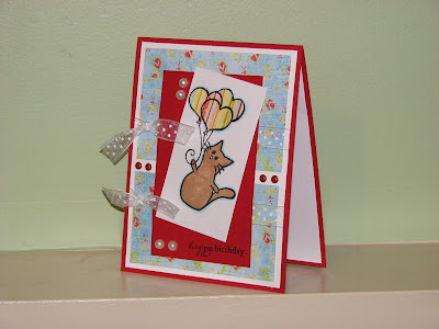 So...back to the challenge. I used lots of layers on this card. DSP layers and I popped up kitty's balloons with DSP. That was fun! I love this new DSP I purchased at a local stamping store. I bought one sheet and cannot remember the name of it!! (Sorry!) I added some ribbon (more layers :) ) and blinged it out with pearls and red brads. The sketch is from the Verve Sketch Challenge.