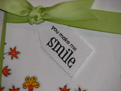 I added last year's Sale-A-bration Celery ribbon to the top of the card and did a double knot for the bow. The tag is attached with dimensionals as is the whole front panel. I don't think I have ever popped up the whole front panel before!!