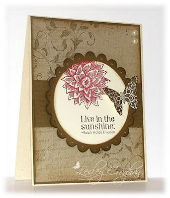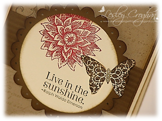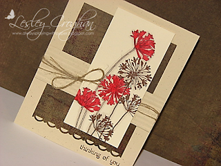 I found the Wednesday Sketch Challenge over at My Favorite Things and decided to try to make it clean and simple with the colours Ivory, Chocolate and Red. You'll notice that I tied a bow with my natural linen thread and that respresents the circle in the sketch. I tried to add a butterfly but it just didn't look right to me on the card! I went for a natural look to this card with the thread and the feel so my card would qualify for the There She Goes Challenge to be Au Natural.