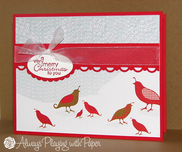 This week's sketch is REALLY simple...I wanted to be able to create a card quickly and I wanted to use some of the Christmas paper I hoard stash away in my drawers. So here it is, what do you think? I must say, this card is made from "recycled" stuff from my "need to use drawer", that includes the ribbon and the card base in Real Red. Aren't the birds so "tweet".