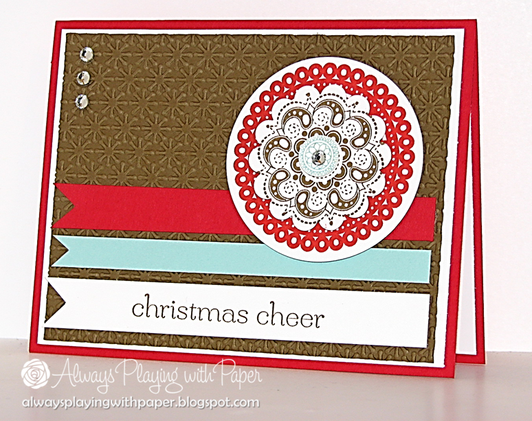 I was excited to design for this week, but I didn't quite follow my sketch exactly...I was inspired by a couple of challenges which just made me need to use three strips of paper instead of two! So my third piece represents the ribbon in my sketch! I LOVE this Stampin' Up stamp set called "Lacy and Lovely", it is so much fun to use with punches and I think it is so pretty! I have been using it all week, so my upcoming design team cards might start to look the same! Ha! Do you think it is ok for a Christmas card?