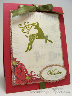 After I saw Judy's gorgeous card this week, I hurriedly went and ordered that glimmer paper! It is such a stunning background for her clean and simple stamping. The bow is perfection and the way she cut out the tree base in the glimmer paper was ingenious! I loved the designer paper too...just so elegant and classy. A wonderfully traditional Christmas creation! Congrats, Judy, for being the Challenge Winner this week!